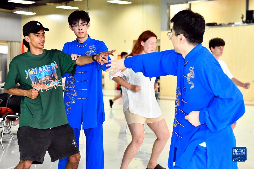 7月20日,在中國石油大學(xué)(華東)沉浸式中醫(yī)藥文化體驗中心,黃島區(qū)中醫(yī)醫(yī)院的醫(yī)護人員教留學(xué)生學(xué)習(xí)八段錦。