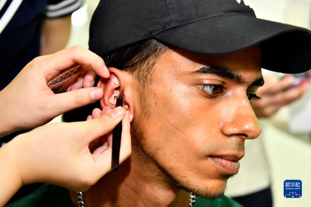 7月20日,在中國石油大學(華東)沉浸式中醫藥文化體驗中心,留學生在體驗耳穴壓豆中醫療法。