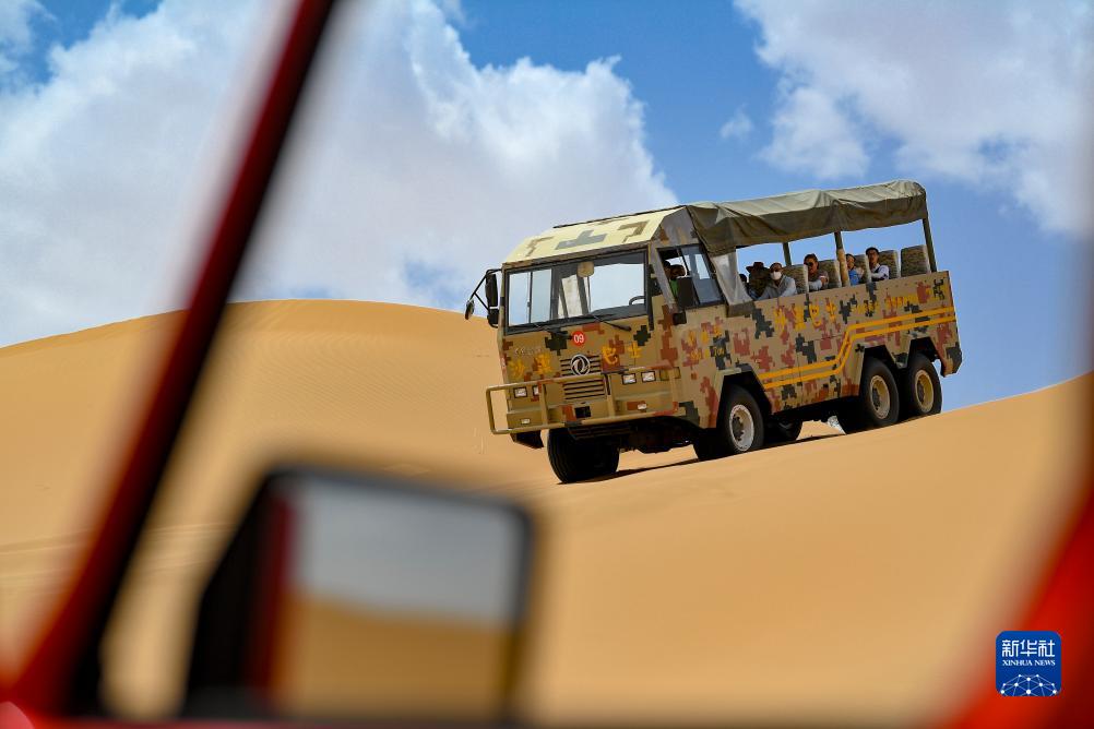 7月20日,游客在寧夏中衛市沙坡頭景區體驗沙漠沖浪車。