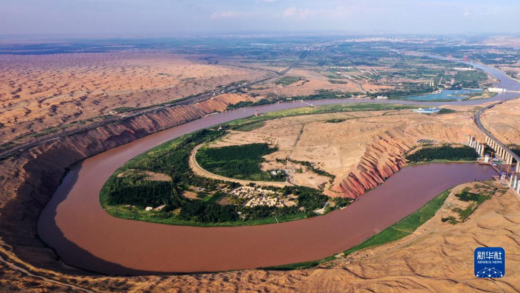 這是7月20日拍攝的位于黃河、沙漠交匯處的寧夏中衛(wèi)市沙坡頭景區(qū)(無人機照片)。