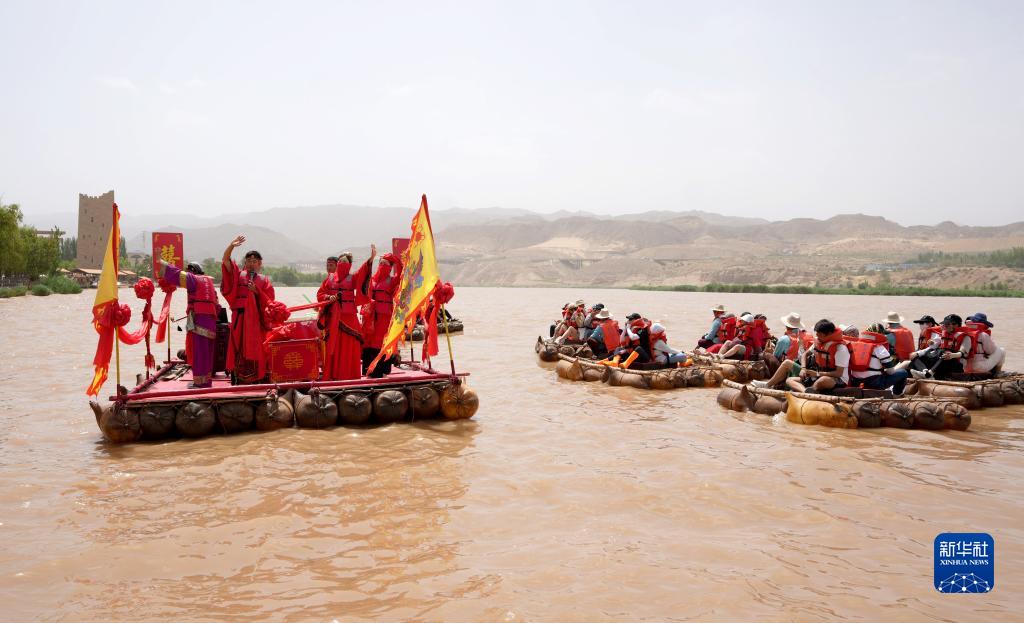 7月20日,演員在寧夏中衛市沙坡頭景區表演“羊皮筏子上的婚禮”,展現黃河兩岸婚俗。