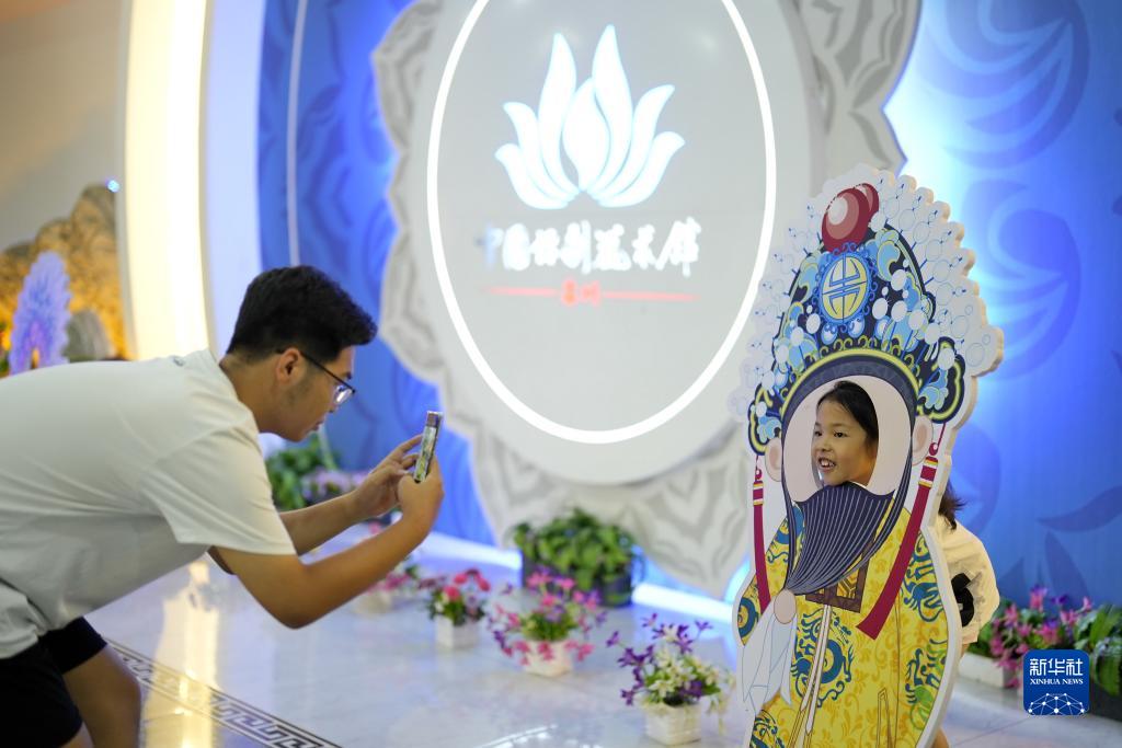 7月21日,在位于河北省灤州市的中國評劇藝術(shù)館,家長在給孩子拍照。