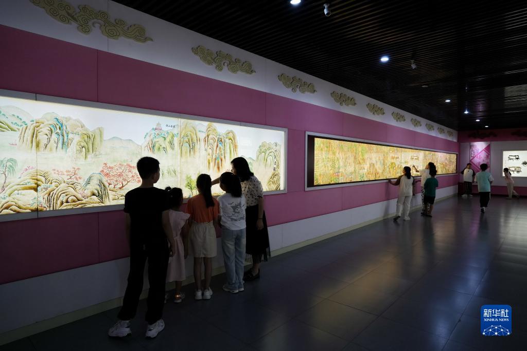 7月21日,孩子們在中國灤州皮影博物館內參觀皮影長卷。