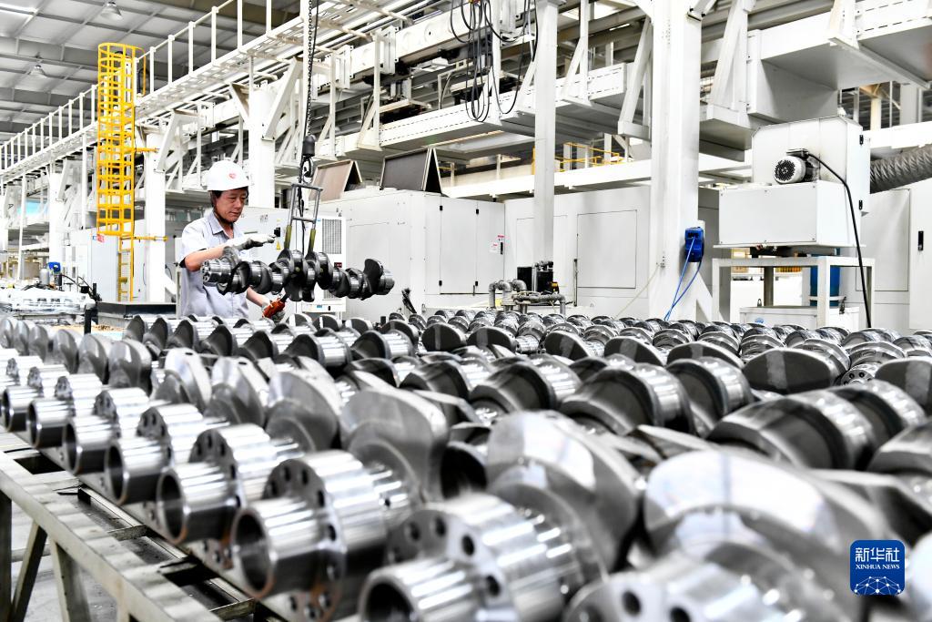7月21日,在位于威海市文登區的天潤工業技術股份有限公司,工人在吊運曲軸產品。