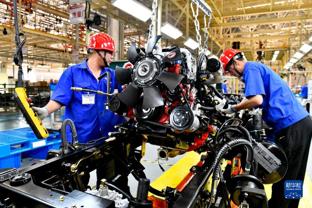7月21日,在位于威海市文登區的濰柴新能源商用車有限公司,工人在生產線上裝配汽車。