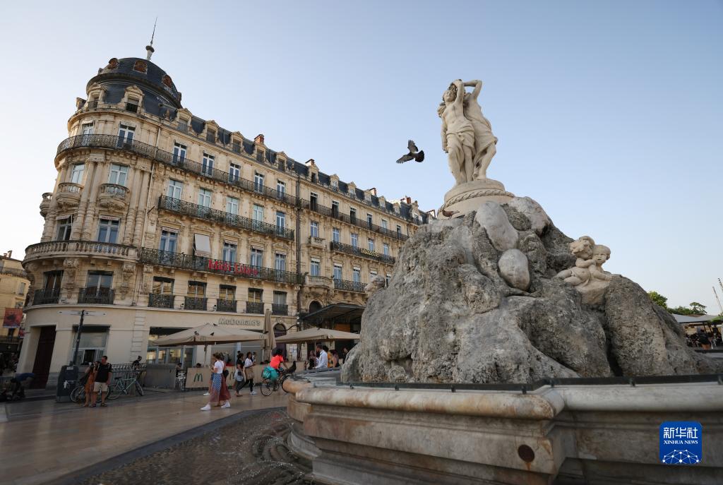 這是法國蒙彼利埃喜劇廣場上的噴泉(7月17日攝)。