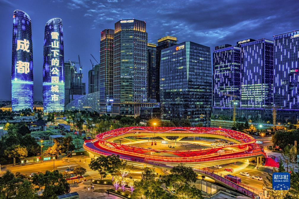 這是成都金融城雙子塔(左)和景觀橋梁“交子之環(huán)”(右下)(2021年8月27日攝)。