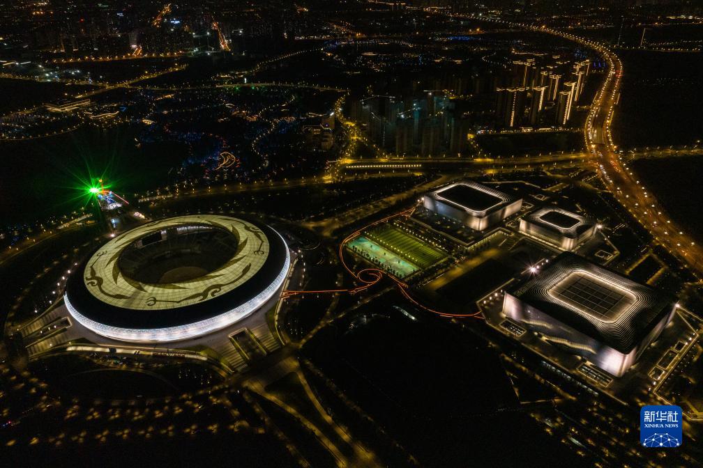 這是成都東安湖體育公園內(nèi)的第31屆世界大學(xué)生夏季運動會開幕式主體育場(左)、主火炬和三個運動場館(4月19日攝,無人機(jī)照片)。