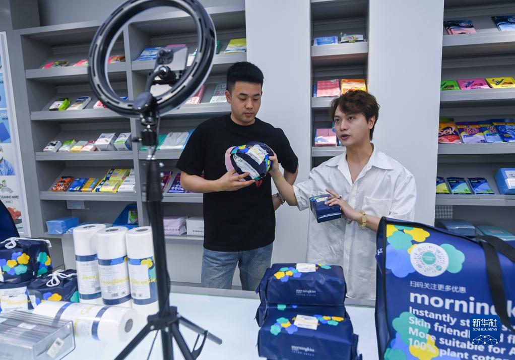 7月21日,在位于杭州市臨安區(qū)高虹鎮(zhèn)的浙江晨陽無紡布科技有限公司展廳內(nèi),沈屹航(右)在直播推薦產(chǎn)品。沈屹航是“95后”歸國留學(xué)生,回到家鄉(xiāng)后,通過電商直播的方式推動(dòng)無紡布產(chǎn)品拓展新的銷售渠道。