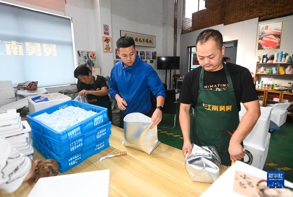 7月21日,在杭州市臨安區高虹鎮崇陽村,何江南(中)和村民們在倉庫里打包,準備發貨。何江南回鄉后通過短視頻創作加帶貨直播形式,宣傳家鄉美食美景,實現村級土特產銷售和村民收入雙提升。