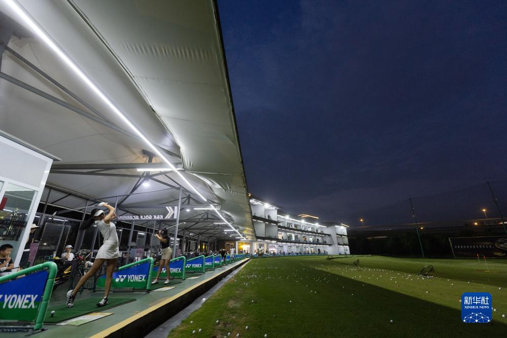 高爾夫球愛好者在成都新陣地高爾夫練習場練習(7月18日攝)。