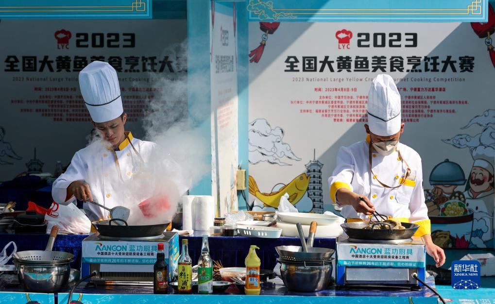 廚師在寧德首屆全國大黃魚美食烹飪大賽上烹飪大黃魚(4月9日攝)。