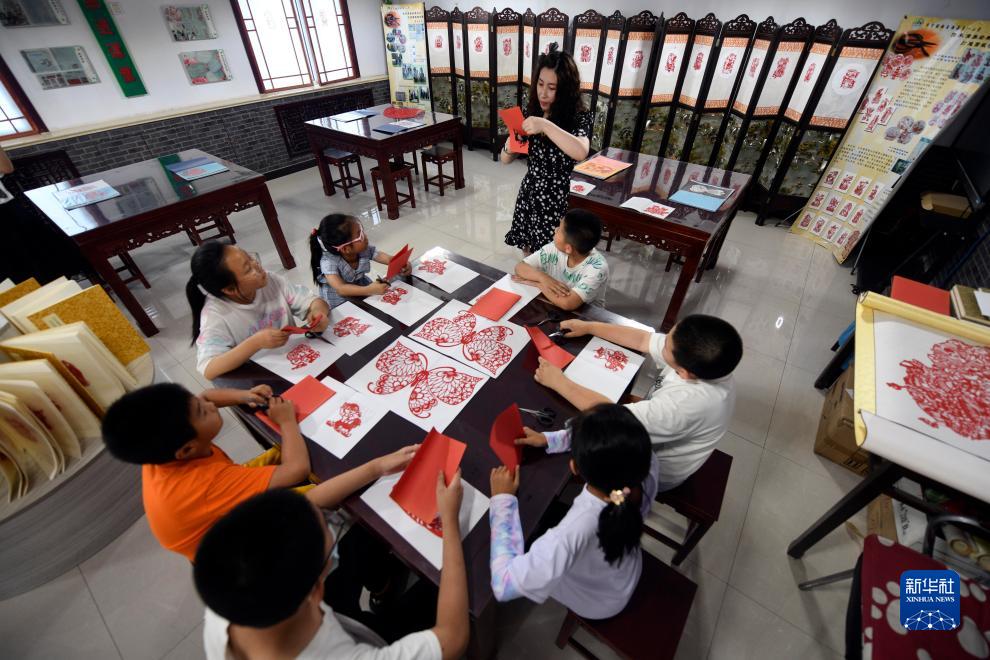 7月21日,在河北省豐寧縣暑假“非遺小課堂”,豐寧縣第一小學教師任洪茹為學生講解剪紙技藝。