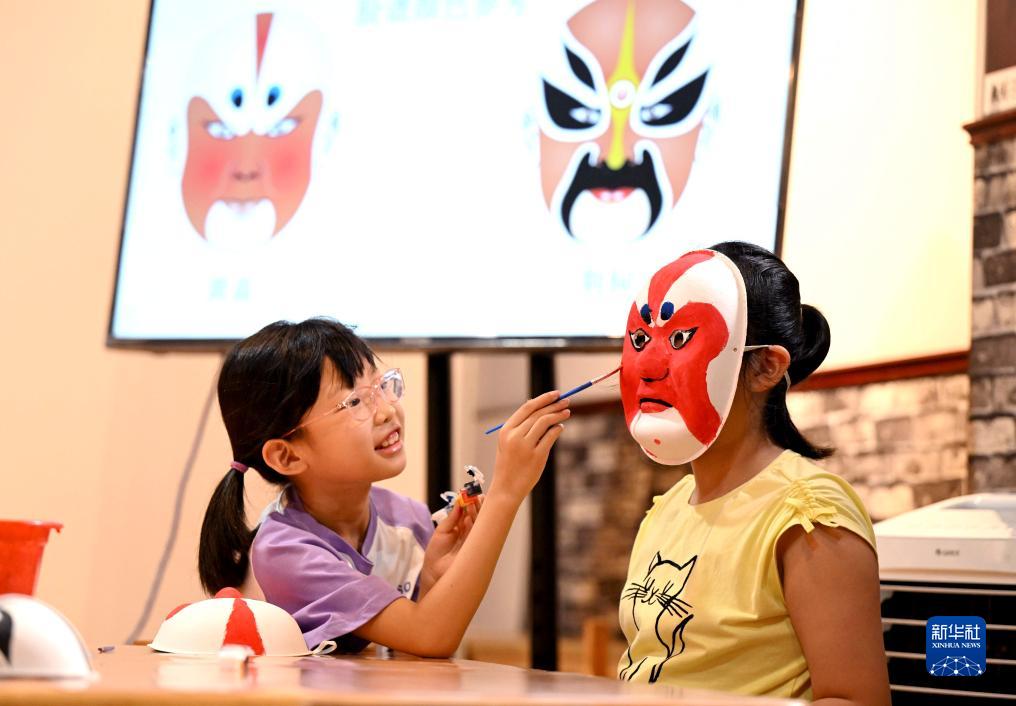 7月21日,小朋友在河北省石家莊市橋西區冀臺聯文化產業園學習臉譜制作技藝。