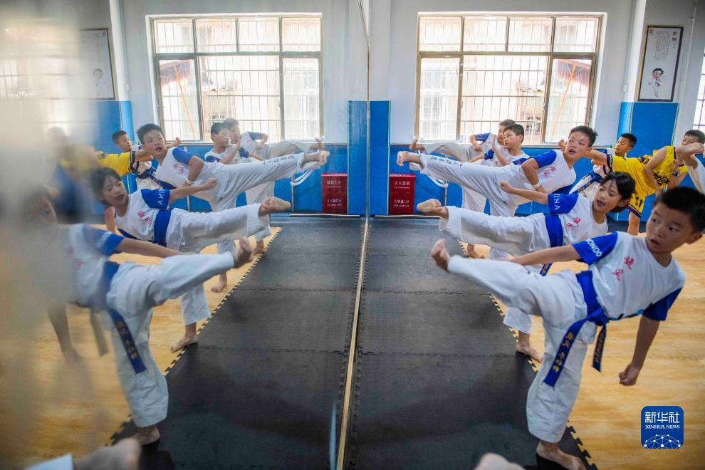 7月21日,在湖南省永州市道縣一跆拳道培訓機構內,學生在練習跆拳道。