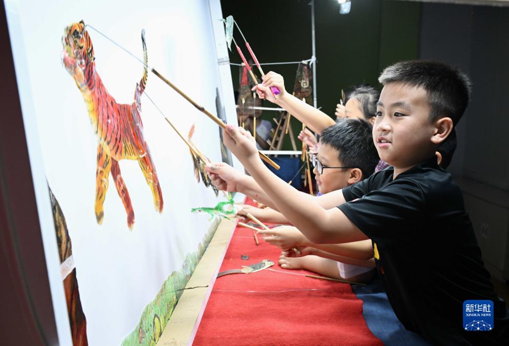7月21日,小朋友在河北省石家莊市橋西區冀臺聯文化產業園體驗皮影戲表演。