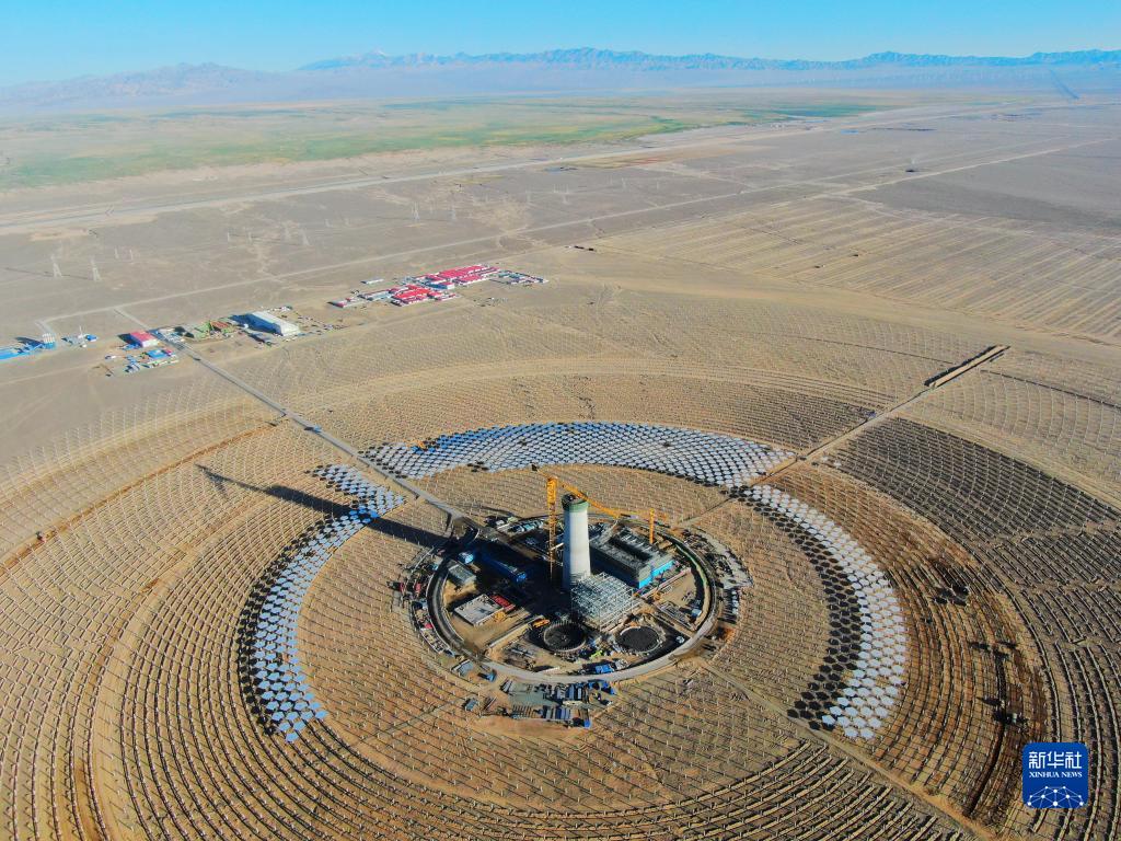 7月21日在阿克塞千萬千瓦級可再生能源多能互補基地拍攝的匯東新能源75萬千瓦光熱+項目建設現場(無人機照片)。