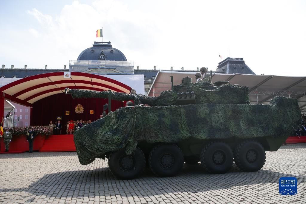 7月21日,軍人駕駛軍事車輛在比利時布魯塞爾參加國慶日閱兵式。