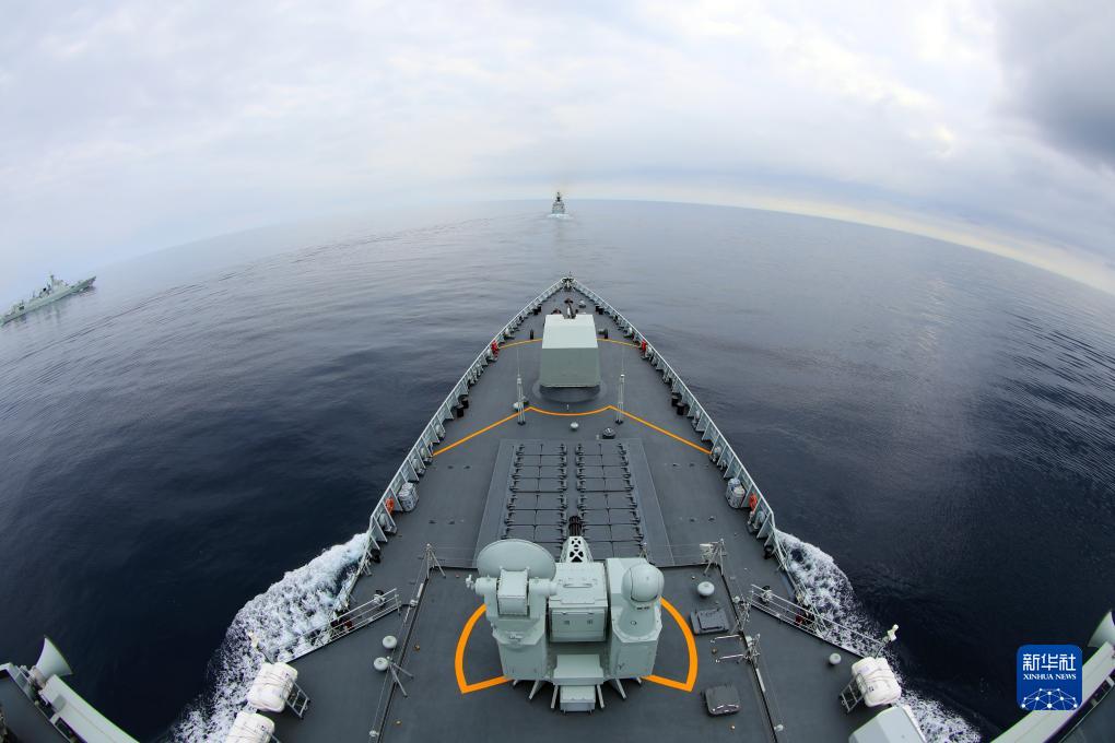 7月20日,在日本海某海域進行的“北部·聯(lián)合-2023”演習中,中方海上作戰(zhàn)群指揮艦齊齊哈爾艦破浪前行。