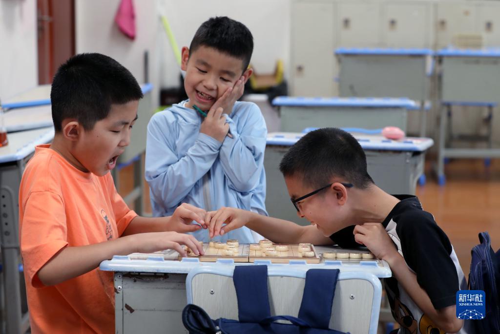 7月19日,在小學生愛心暑托班“新業態新就業群體子女專班”,從湖北襄樊來上海過暑假的“小候鳥”高智明(左)和小伙伴們下棋。