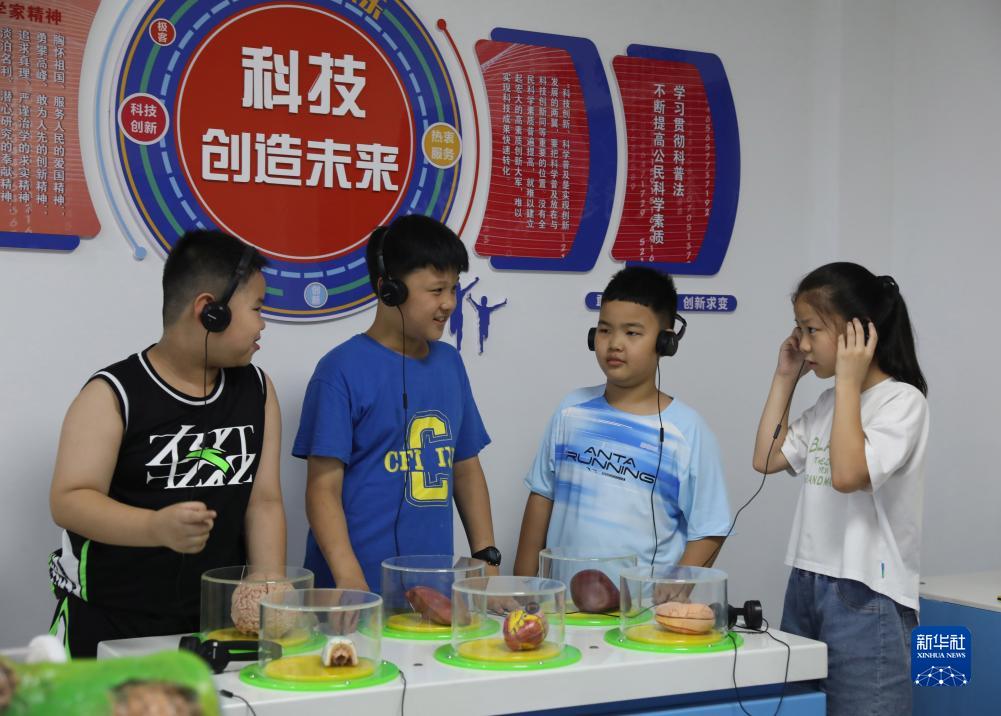 7月21日,幾名小學(xué)生在山東省樂(lè)陵市市中街道南鑫社區(qū)新時(shí)代文明實(shí)踐站科普館接受科普教育。