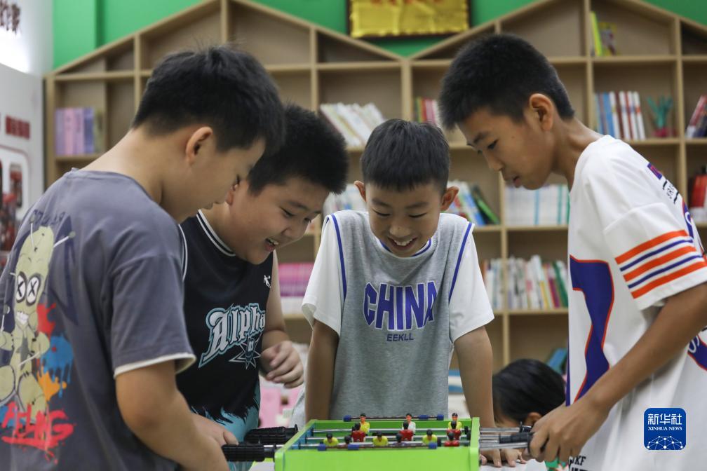 7月21日,幾名小學生在山東省樂陵市市中街道南鑫社區新時代文明實踐站暑期托管班進行桌式足球游戲。