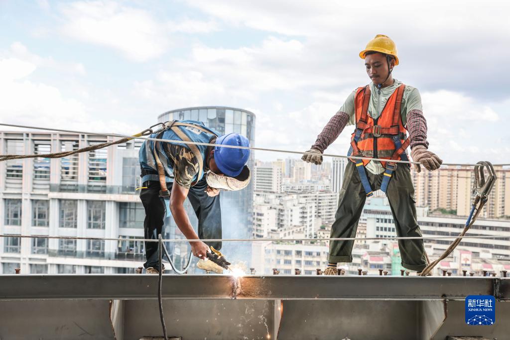 7月21日,工人在海口市海南中心項目的“空中造樓機”內施工作業。