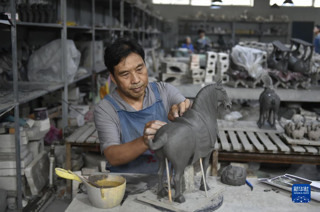 7月19日,在南石山村一家生產企業的車間里,唐三彩藝人高順旺在雕刻泥胎。