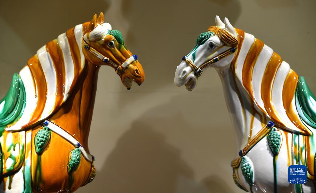 這是7月19日在南石山村一家唐三彩生產企業的展廳里拍攝的唐三彩作品。