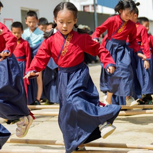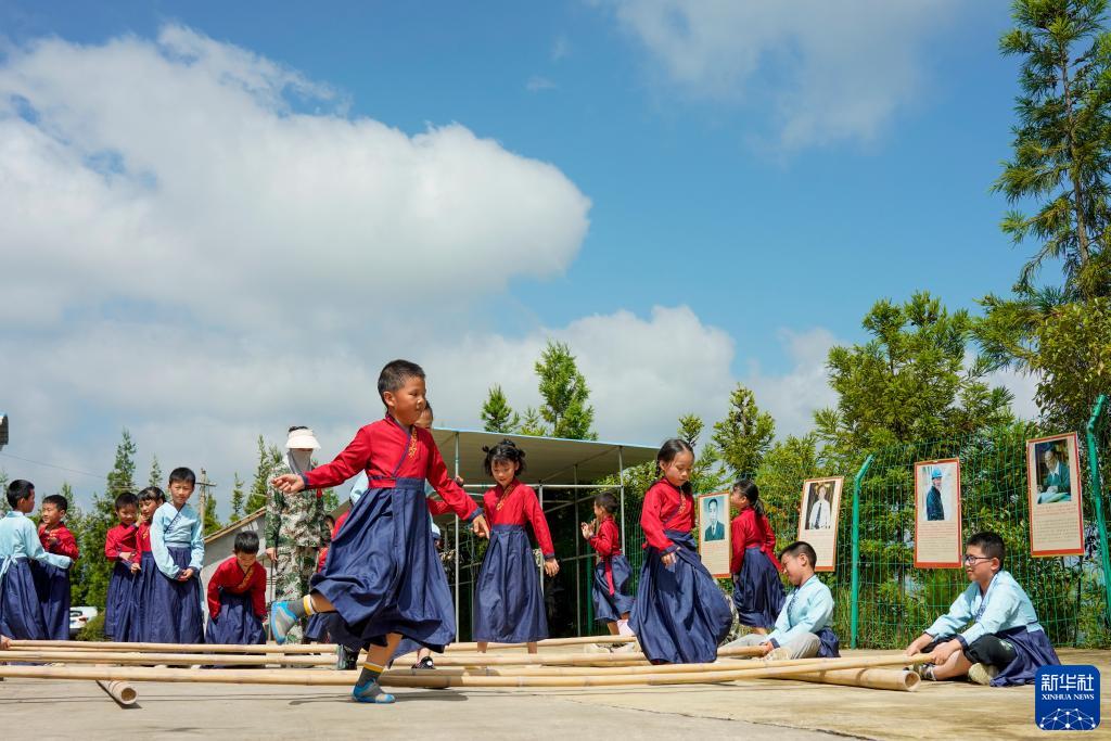 7月22日,萬州區恒合土家族鄉一個研學基地內,參加暑期避暑研學活動的學生在練習傳統體育運動跳竹竿。