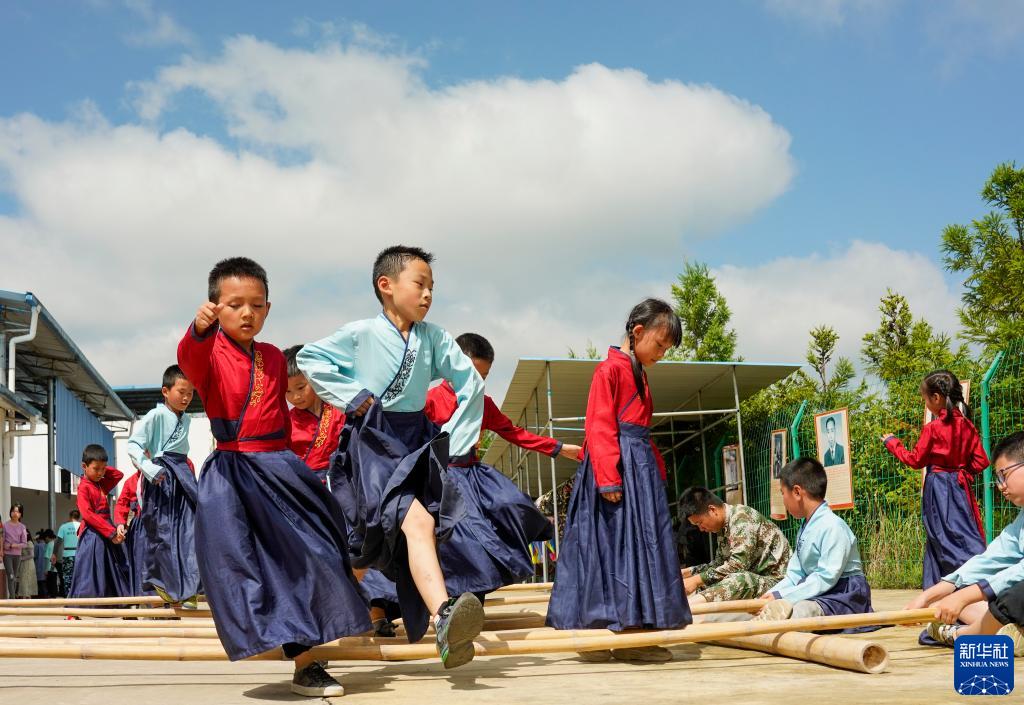 7月22日,萬州區恒合土家族鄉一個研學基地內,參加暑期避暑研學活動的學生在練習傳統體育運動跳竹竿。