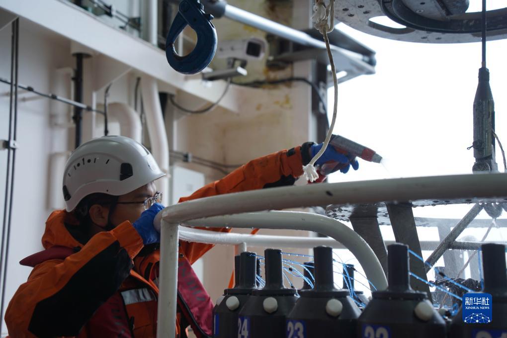 7月22日,中國第13次北冰洋科學考察隊進行大洋作業(yè)演練,CTD(溫鹽深多參數(shù)海洋觀測系統(tǒng))采集海水樣品完畢,隊員用淡水對其進行清潔。