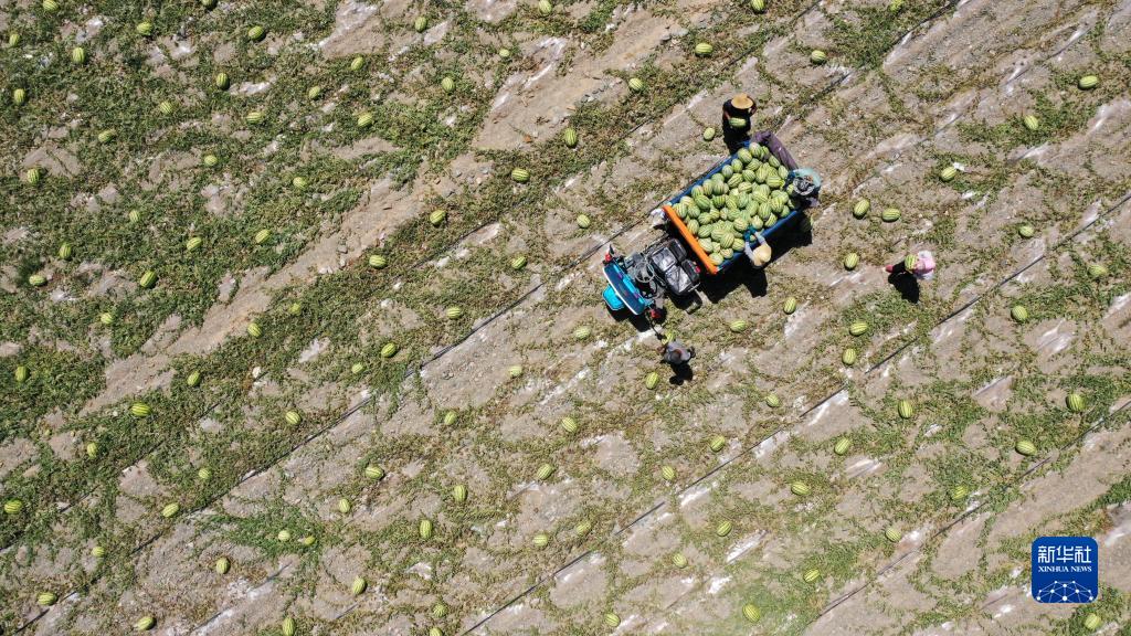 農戶在中衛市沙坡頭區香山鄉收獲硒砂瓜(無人機照片,7月21日攝)。