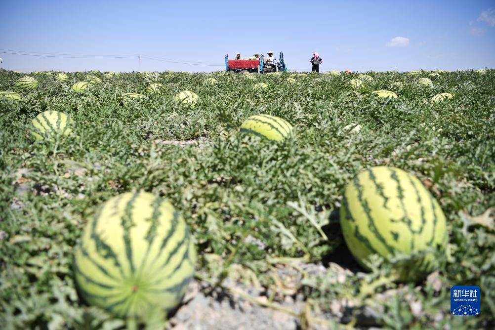 農(nóng)戶在中衛(wèi)市沙坡頭區(qū)香山鄉(xiāng)收獲硒砂瓜(7月21日攝)。