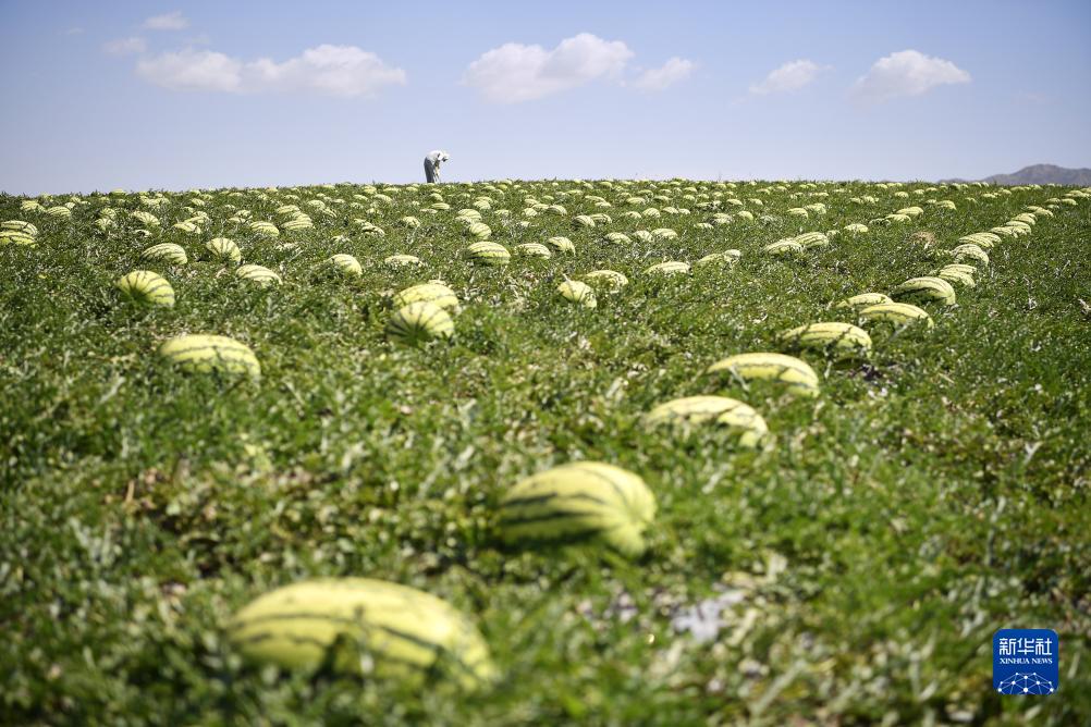 農戶在中衛市沙坡頭區香山鄉收獲硒砂瓜(7月21日攝)。