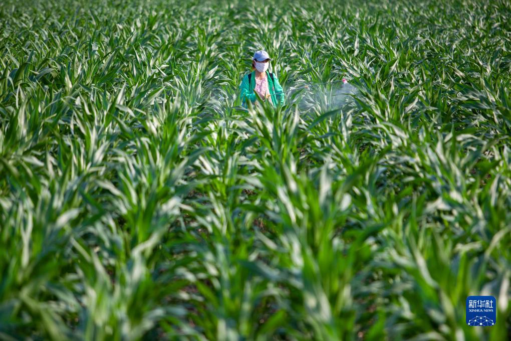 7月22日,在山東省淄博市高青縣黑里寨鎮,農民為玉米進行植保作業。