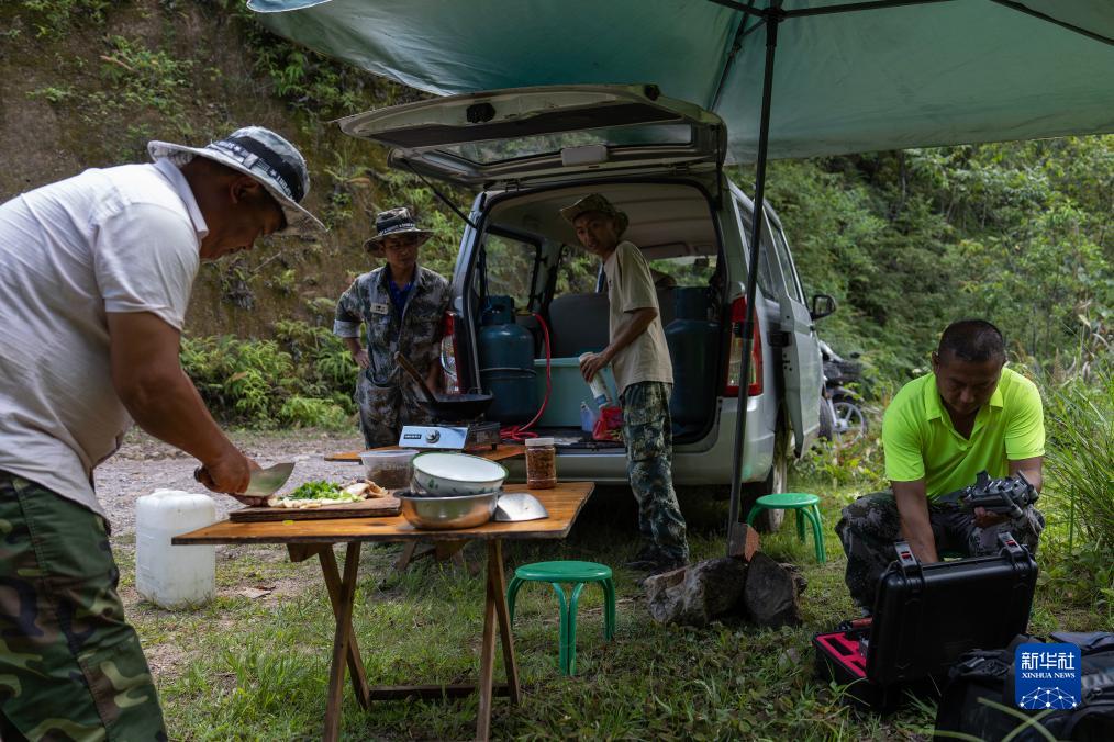7月20日,刁發興(右一)收起無人機,準備和隊友做飯。