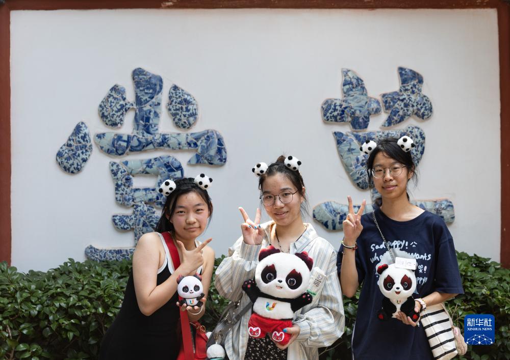7月19日,三名來自河北的游客手捧成都大運會吉祥物“蓉寶”在杜甫草堂景點之一的花徑留影。