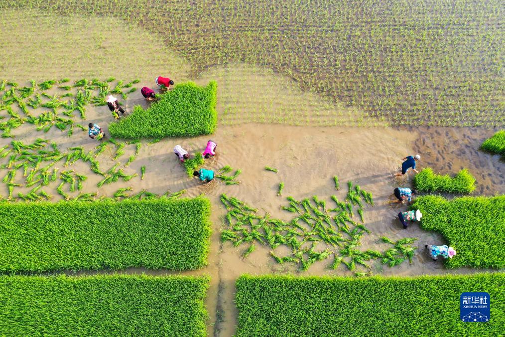 7月23日,在湖南省常寧市三角塘鎮長江村,村民在起晚稻秧苗(無人機照片)。
