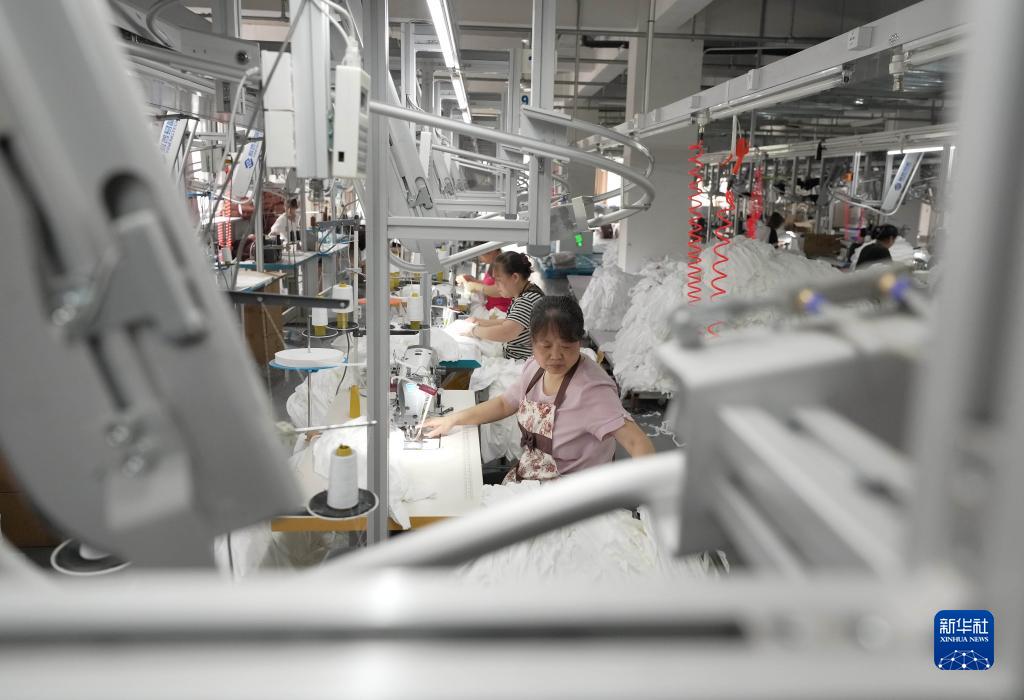 7月23日,工人在肅寧縣一家針紡服裝企業(yè)生產(chǎn)車間工作。