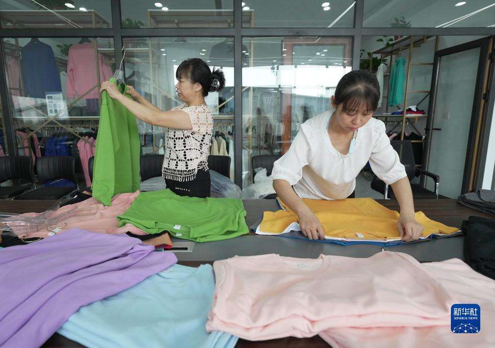 7月23日,工人在肅寧縣一家針紡服裝企業的展室整理準備更換的展品。