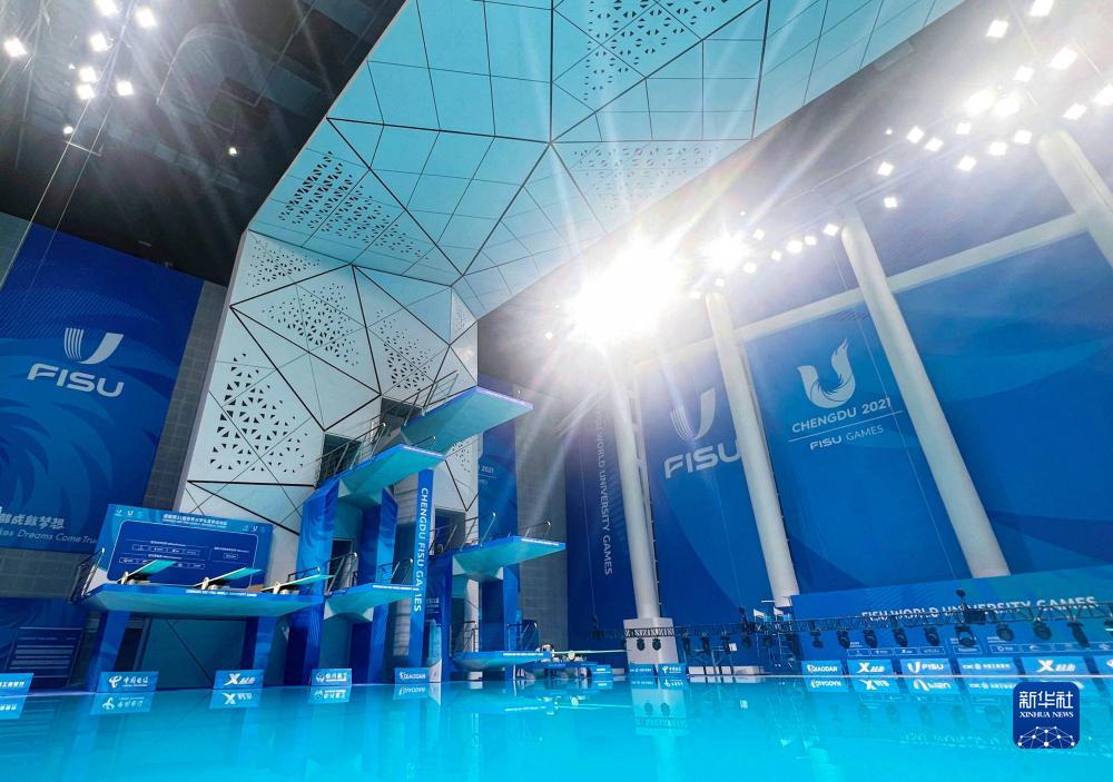 7月22日拍攝的簡陽文體中心游泳館跳水臺,它是我國唯一一座多折面異型清水混凝土跳臺,經(jīng)久耐用且節(jié)約資源。簡陽文體中心游泳館是成都大運會跳水項目的比賽場館。