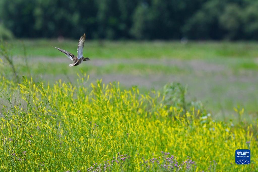 綠頭鴨在拉魯濕地飛翔(7月23日攝)。