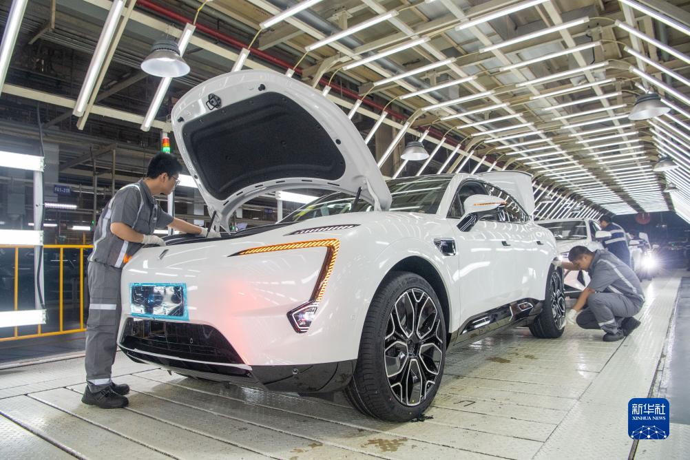7月20日,在位于重慶市江北區的長安汽車生產基地車間內,工作人員在新能源汽車阿維塔生產線上作業。