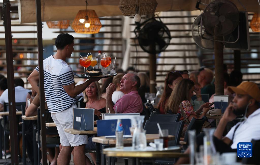 7月18日,人們在法國蒙彼利埃喜劇廣場附近就餐休閑。