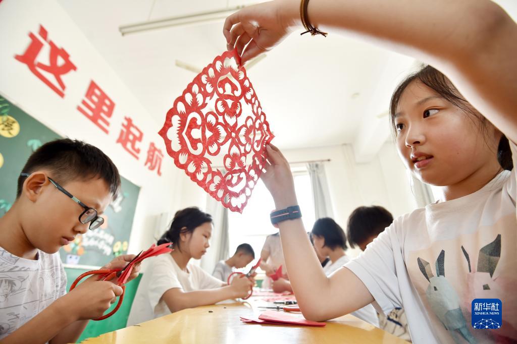 7月24日,在河北省石家莊晉州市東里莊學校,免費托管的孩子們在學習傳統(tǒng)剪紙技藝。