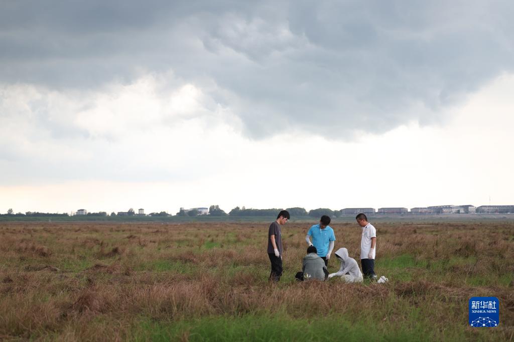 7月9日,中國科學院洞庭湖濕地生態系統觀測研究站科研人員鄒業愛博士(右一)和學生在湖南東洞庭湖國家級自然保護區采樣。
