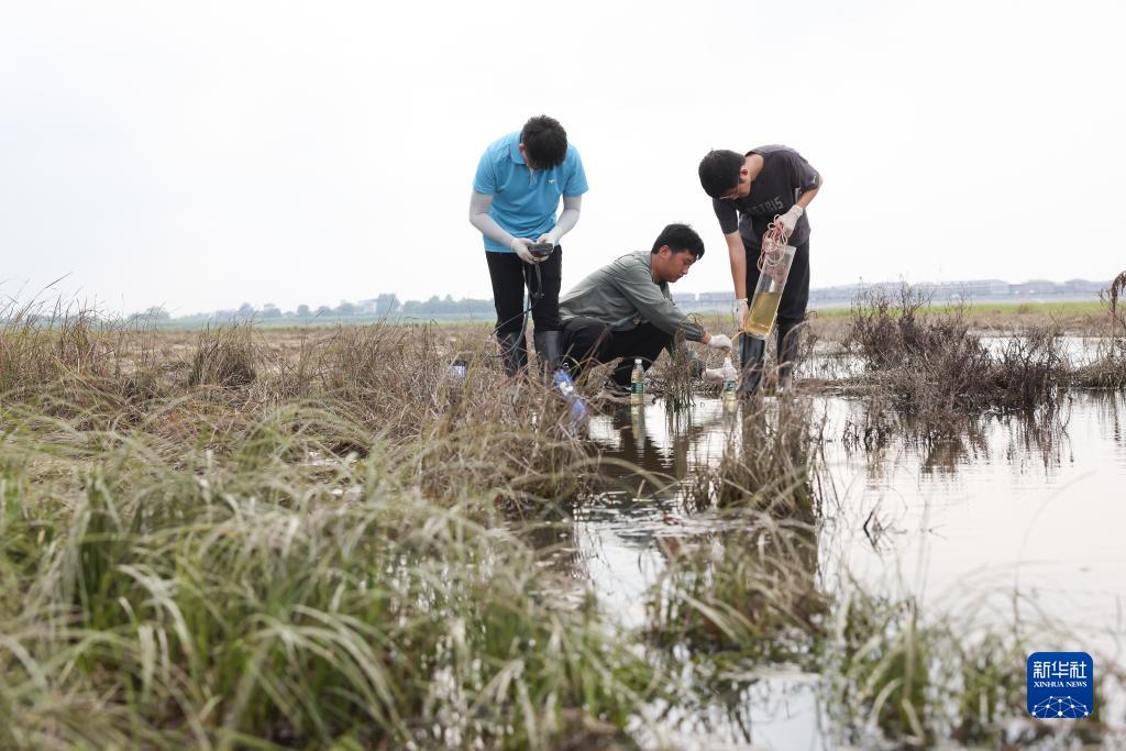 7月9日,中國(guó)科學(xué)院洞庭湖濕地生態(tài)系統(tǒng)觀測(cè)研究站科研人員在湖南東洞庭湖國(guó)家級(jí)自然保護(hù)區(qū)取水樣并測(cè)水質(zhì)。新華社記者 金立旺 攝