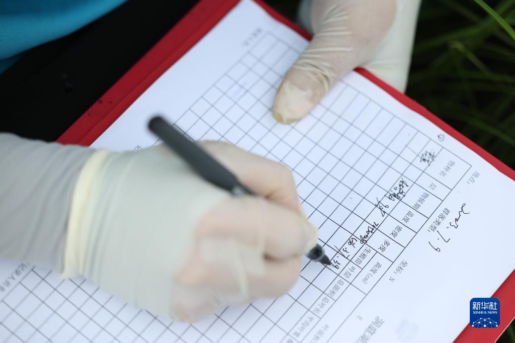 7月9日,中國科學院洞庭湖濕地生態(tài)系統(tǒng)觀測研究站科研人員在湖南東洞庭湖國家級自然保護區(qū)記錄采集苔草樣本的情況。新華社記者 薛宇舸 攝
