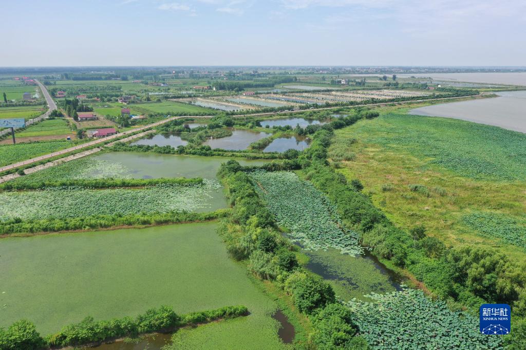 這是7月10日在湖南省益陽市大通湖區河壩鎮拍攝的由中國科學院設計的大通湖流域農業面源污水末端強化處理設施(無人機照片)。大通湖地處洞庭湖腹地,被稱作“洞庭之心”。新華社記者 薛宇舸 攝